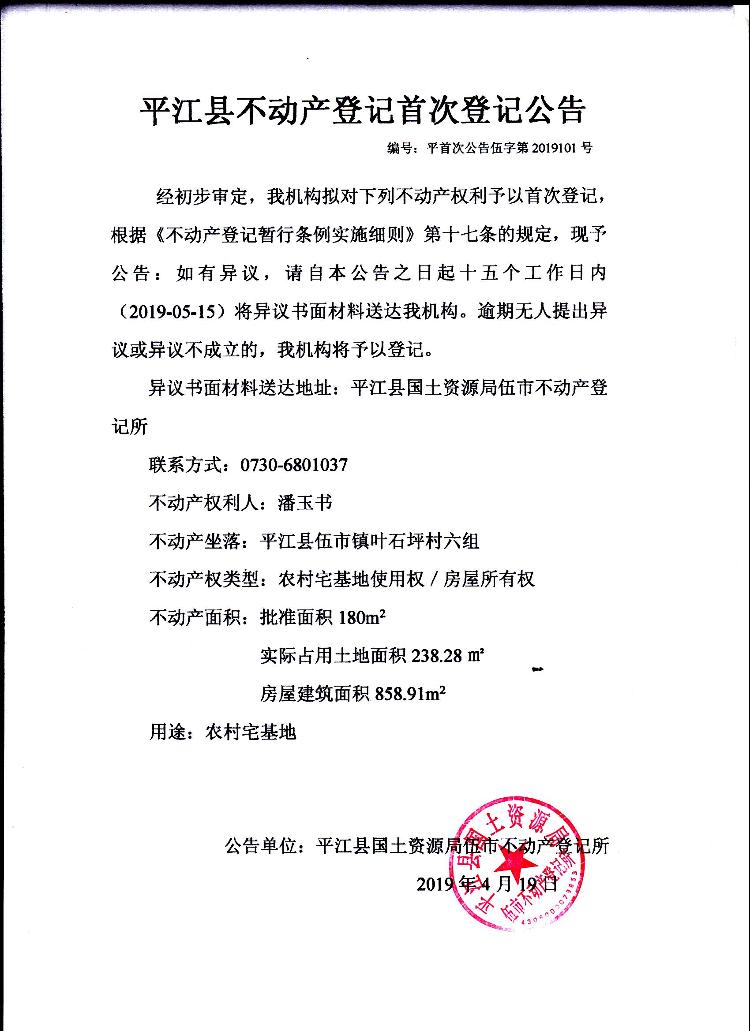 潘玉书 不动产首次登记公告 伍字第2019101号