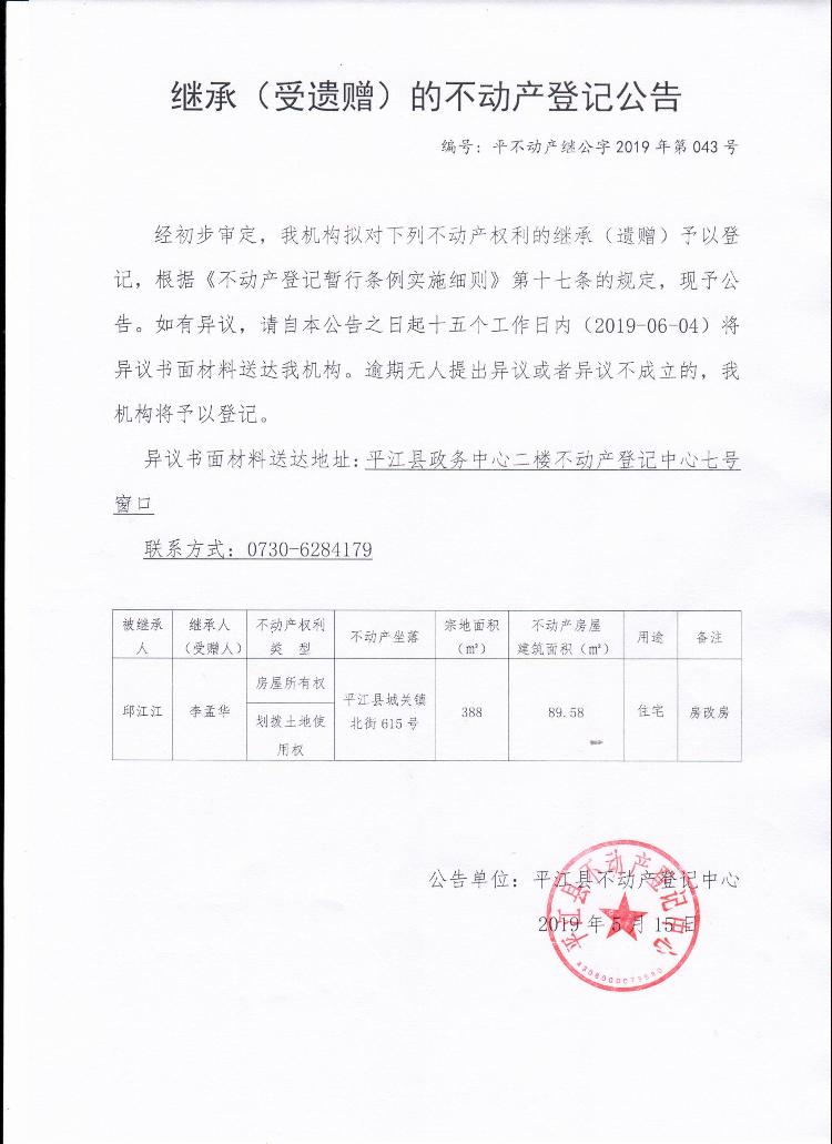 李孟华继承(受遗赠)的不动产登记公告平不动产继公字2019年第043号