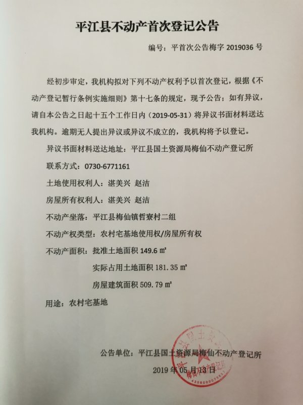 湛美兴 赵洁平江县不动产首次登记公告平首次公告梅字第2019036号
