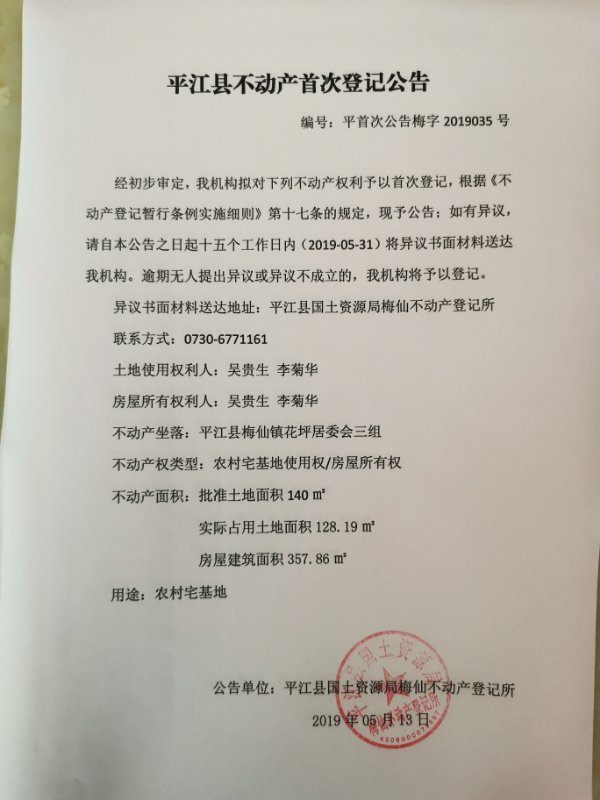 吴贵生 李菊华平江县不动产首次登记公告平首次公告梅字第2019035号