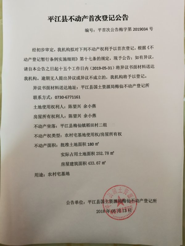 陈望兴、余小燕平江县不动产首次登记公告平首次公告梅字第2019034号
