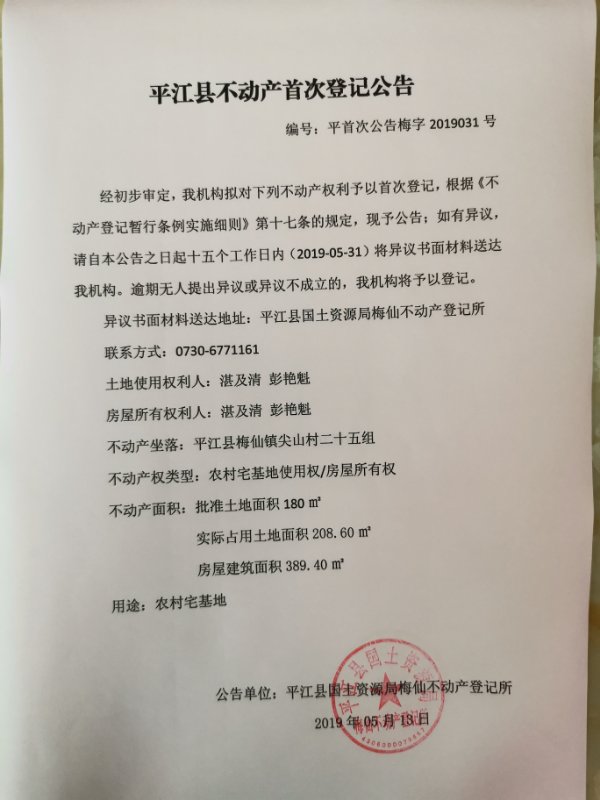 湛及清、彭艳魁平江县不动产首次登记公告平首次公告梅字第2019031号