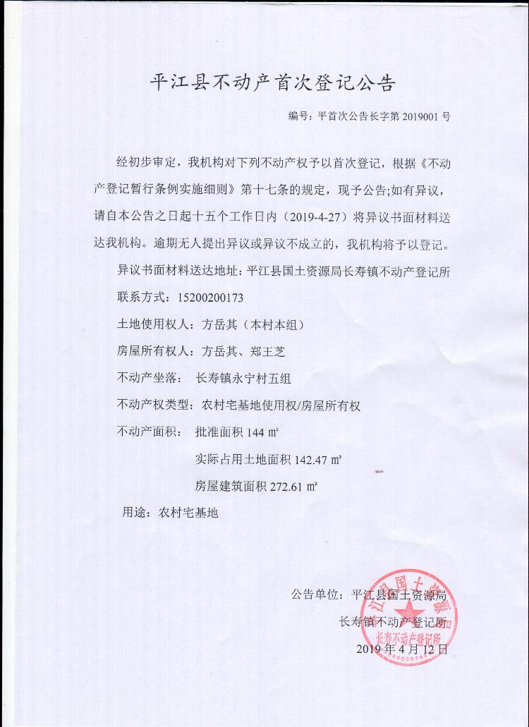 方岳其、郑王芝平江县不动产首次登记公告平首次公告长字第2019001号