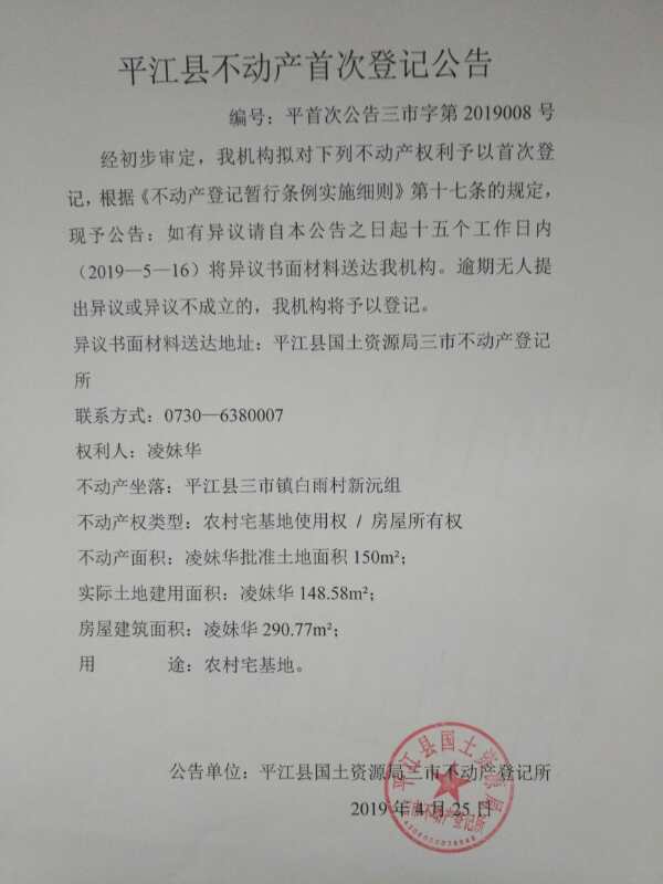 凌妹华平江县不动产首次登记公告平首次公告三市字第2019008号