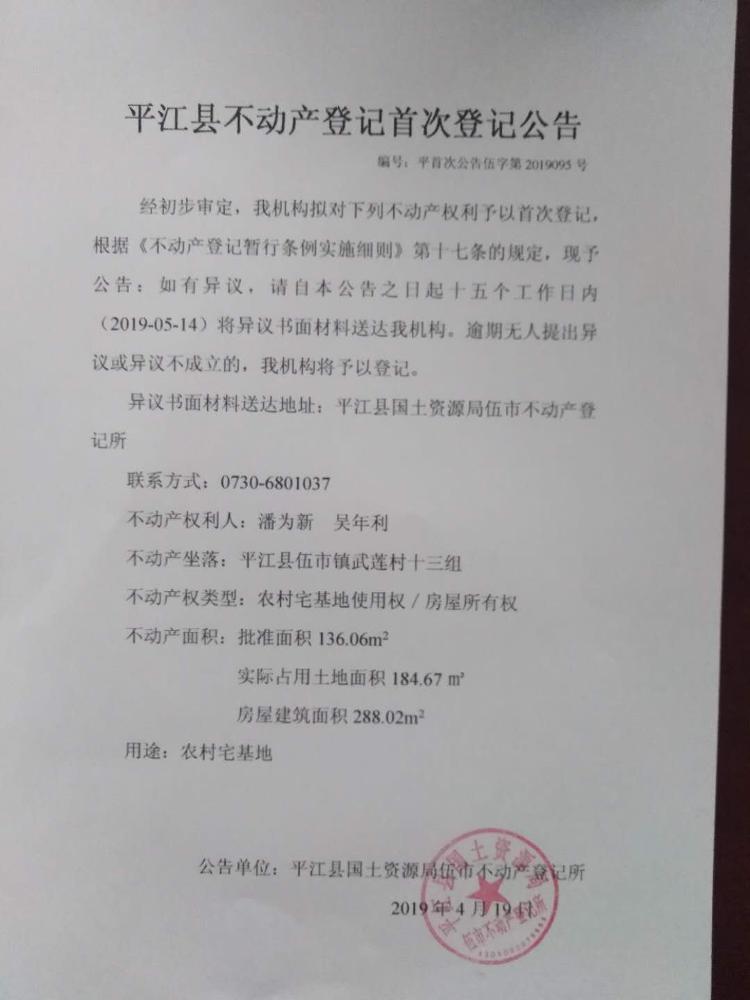 潘为新、吴年利平江县不动产首次登记公告平首次公告伍字第2019095号