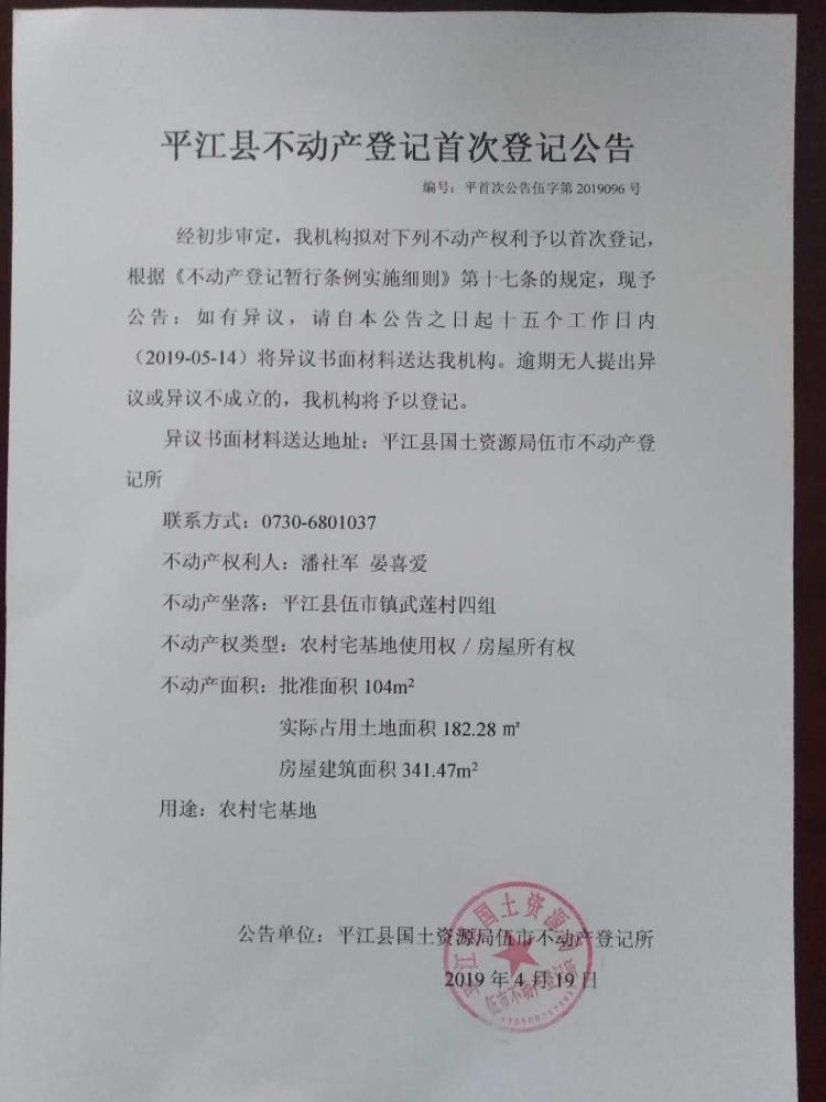 潘社军、晏喜爱平江县不动产首次登记公告平首次公告伍字第2019096号