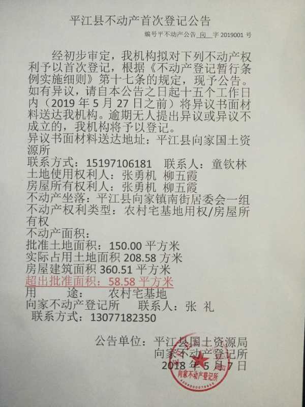 张勇机、柳五霞平江县不动产首次登记公告平不动产公告向字2019001号
