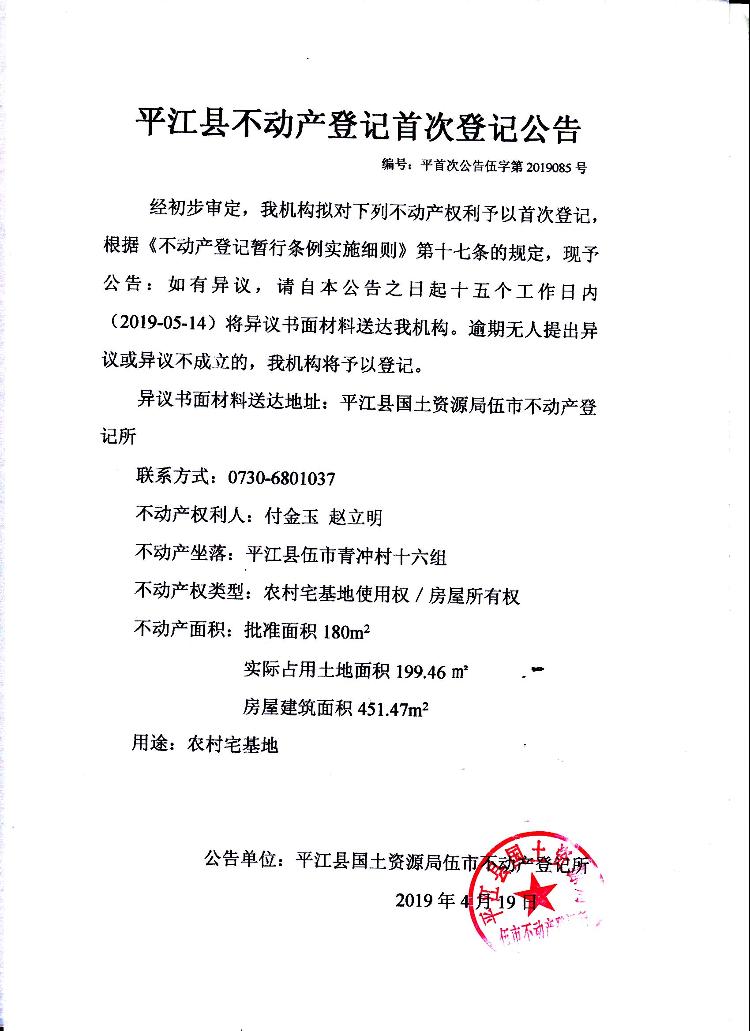付金玉 赵立明 不动产首次登记公告 伍字第2019085号