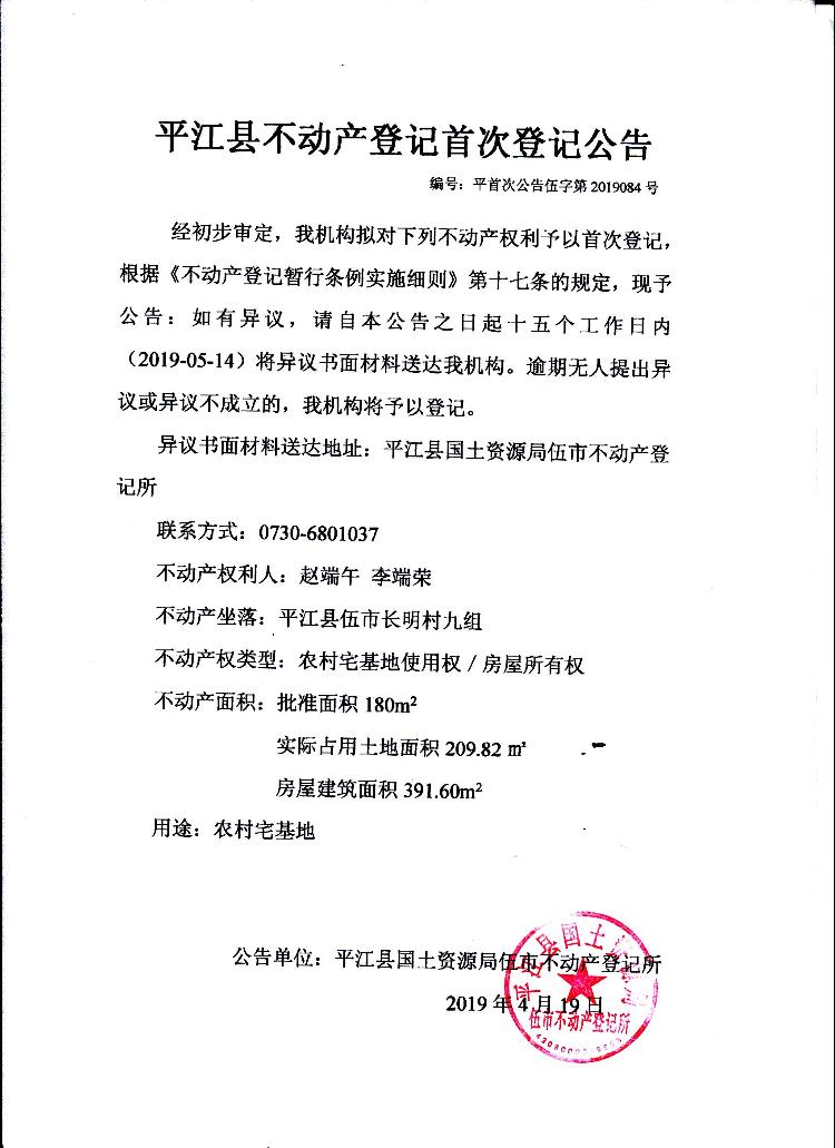 赵端午 李端荣 不动产首次登记公告 伍字第2019084号