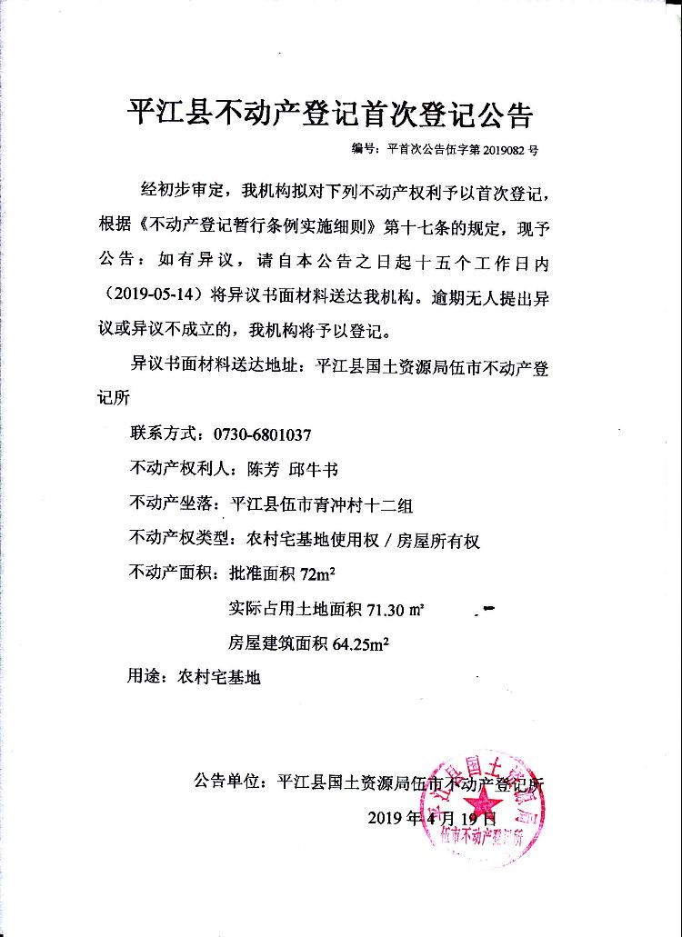 陈芳 邱牛书 不动产首次登记公告伍字第2019082号