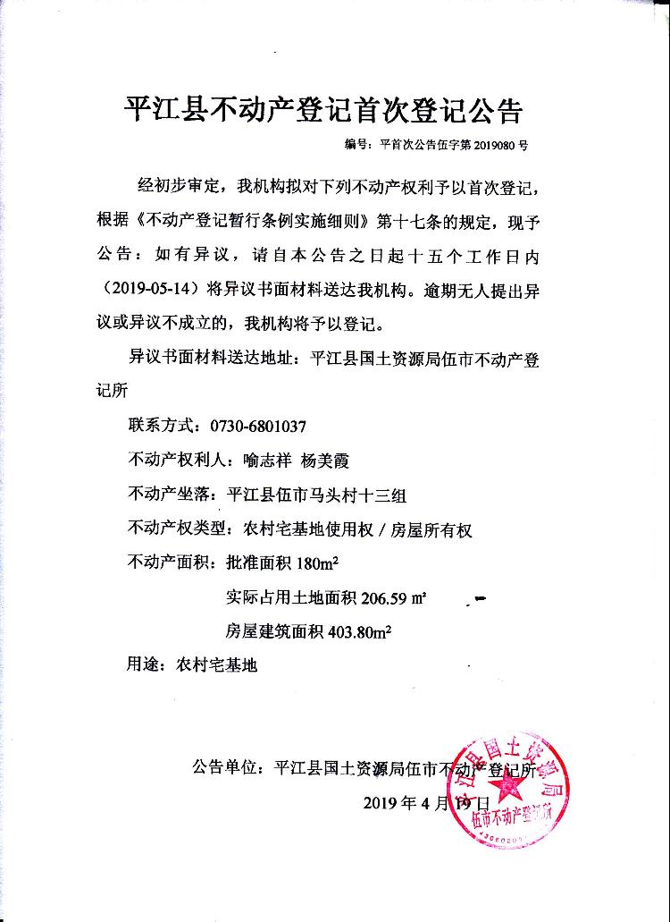 喻志祥 杨美霞 不动产首次登记公告 伍字第2019080号