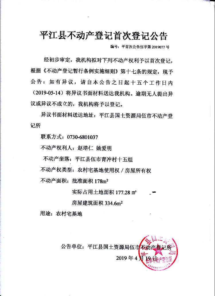 赵培仁 姚爱明 不动产首次登记公告 伍字第2019077号