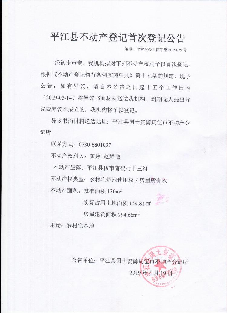 黄炜 赵辉艳 不动产首次登记公告伍字第2019075号