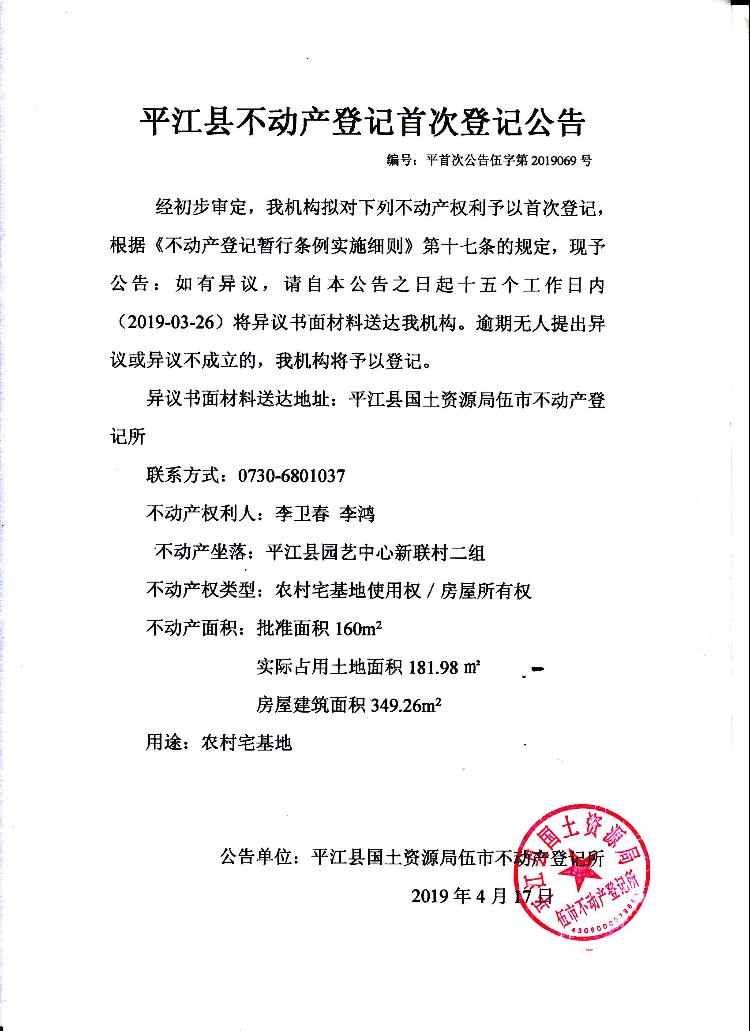 李卫春 李鸿 不动产首次登记公告 伍字第2019069号