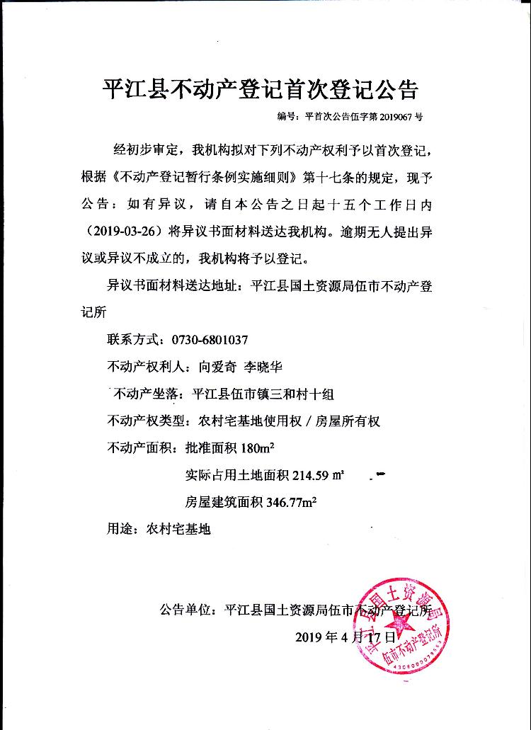 向爱奇 李晓华 不动产首次登记公告 伍字第2019067号