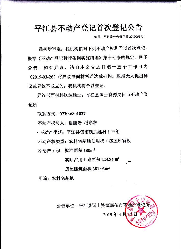 潘鹏署 潘彩林 不动产首次登记公告 伍字第2019066号