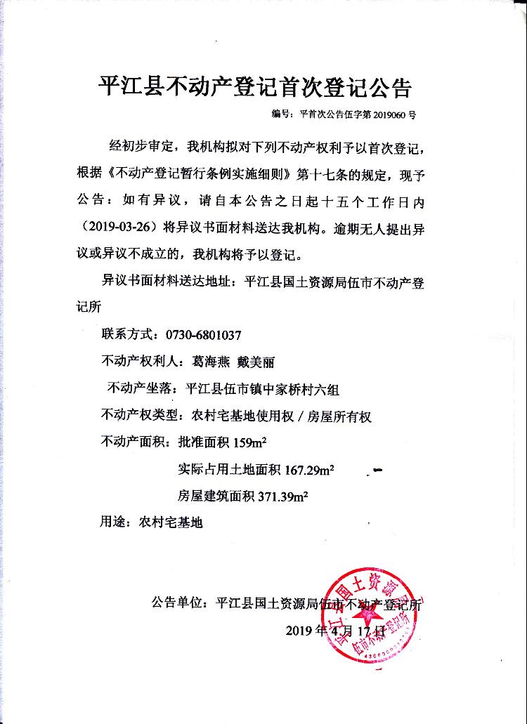 葛海燕 戴美丽 不动产首次登记公告伍字第2019060号