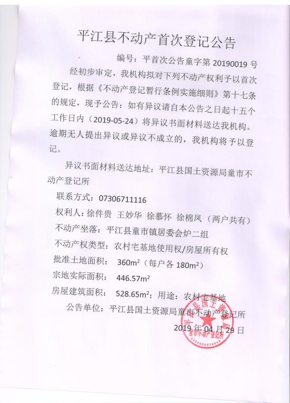 徐件贵、王妙华、徐慕怀、徐棉凤平江县不动产首次登记公告平首次公告童字第20190019号