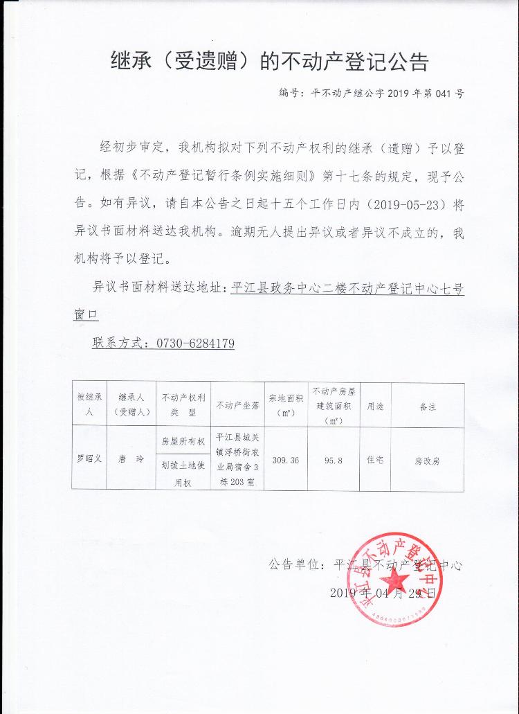 唐玲继承(受遗赠)的不动产登记公告平不动产继公字2019年第041号