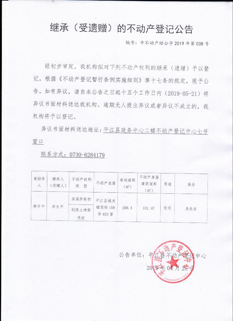 李大平继承(受遗赠)的不动产登记公告平不动产继公字2019年第038号