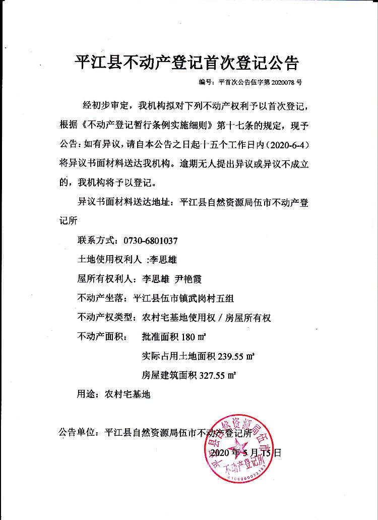 李思雄 尹艳霞 平江县不动产首次登记公告伍字第2020078号