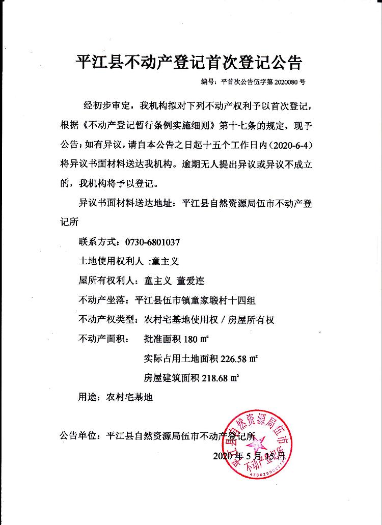 童主义 董爱连 平江县不动产首次登记公告伍字第2020080号