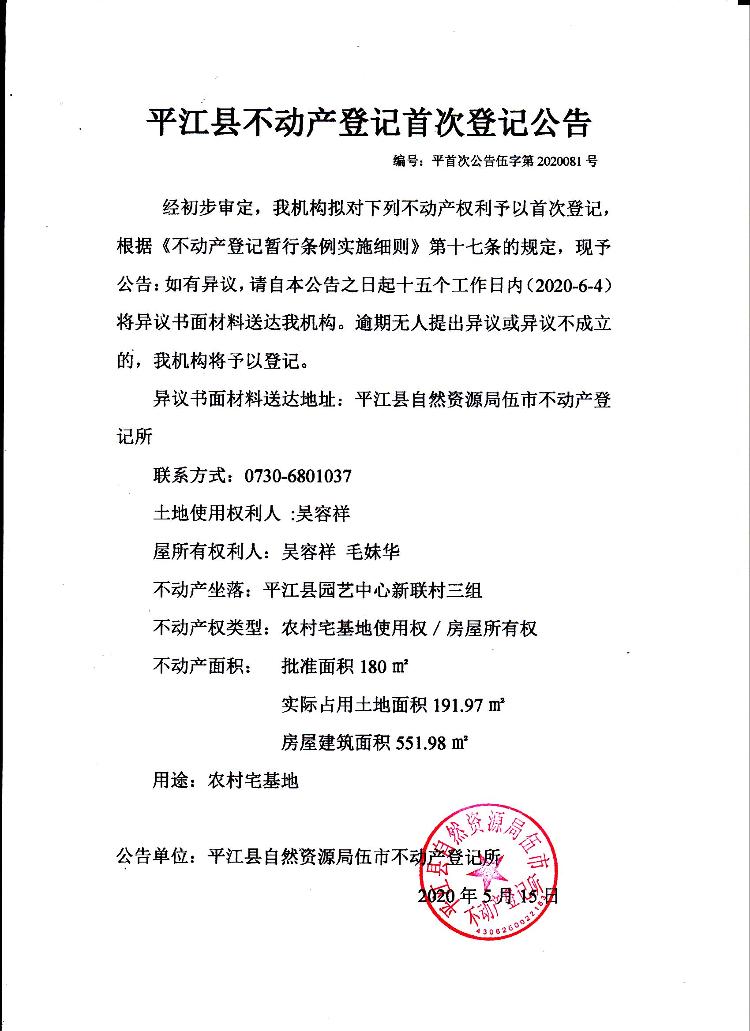 吴容祥 毛妹华 平江县不动产首次登记公告伍字第2020081号