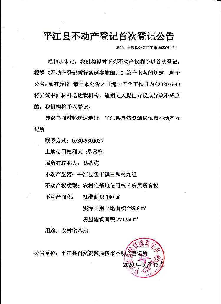易蒂梅 平江县不动产首次登记公告伍字第2020084号