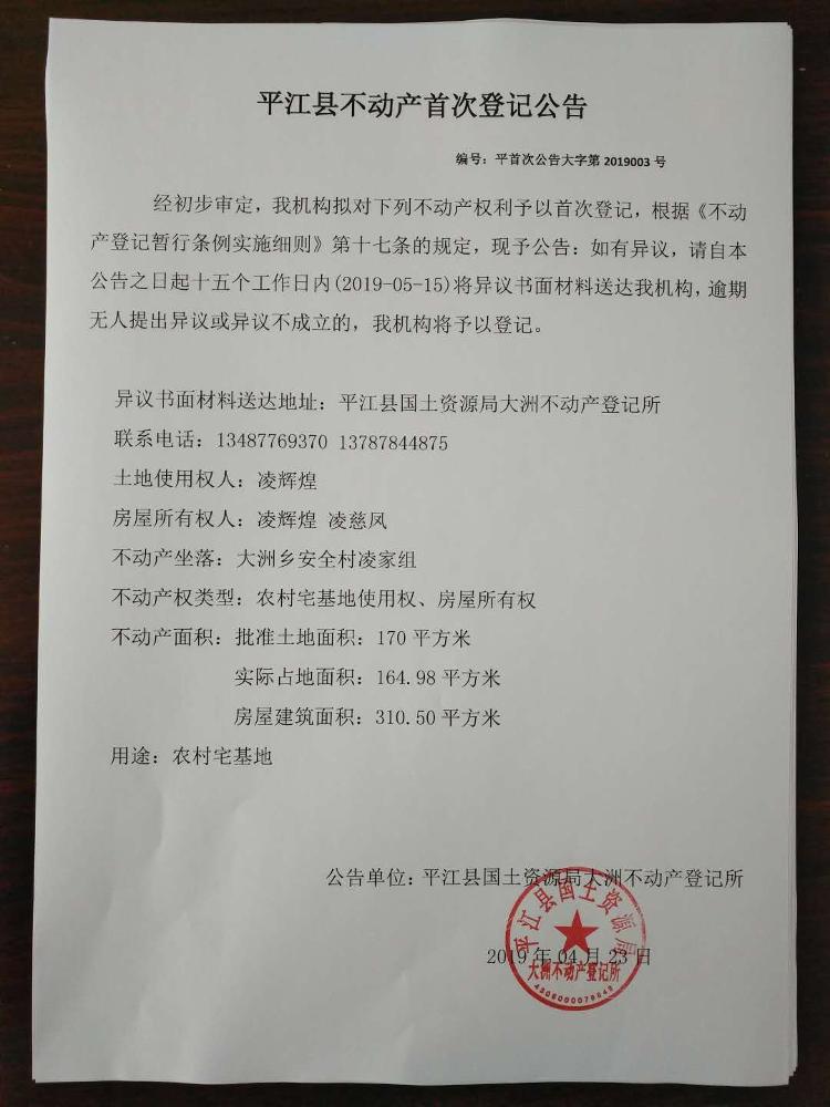 凌辉煌、凌慈凤平江县不动产首次登记公告平首次公告大字第2019003号