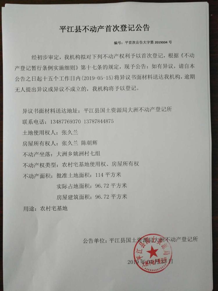 张久兰、陈朝辉平江县不动产首次登记公告平首次公告大字第2019004号