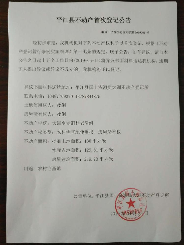 凌俐平江县不动产首次登记公告平首次公告大字第2019005号