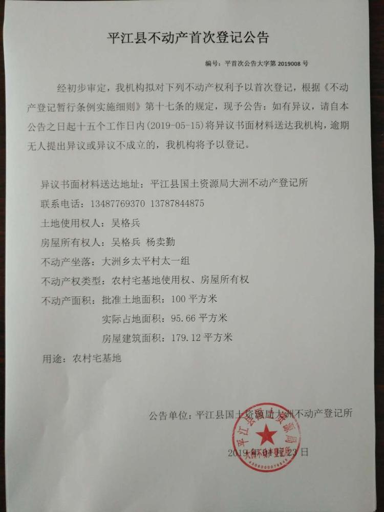 吴格兵、杨卖勤平江县不动产首次登记公告平首次公告大字第2019008号