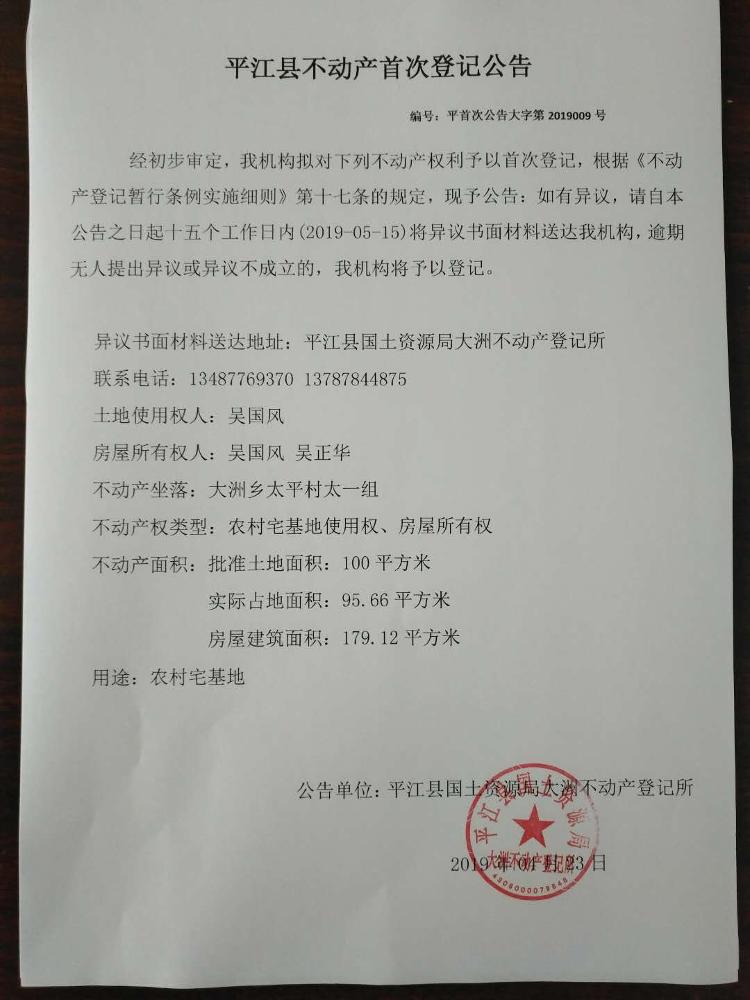 吴国风、吴正华平江县不动产首次登记公告平首次公告大字第2019009号
