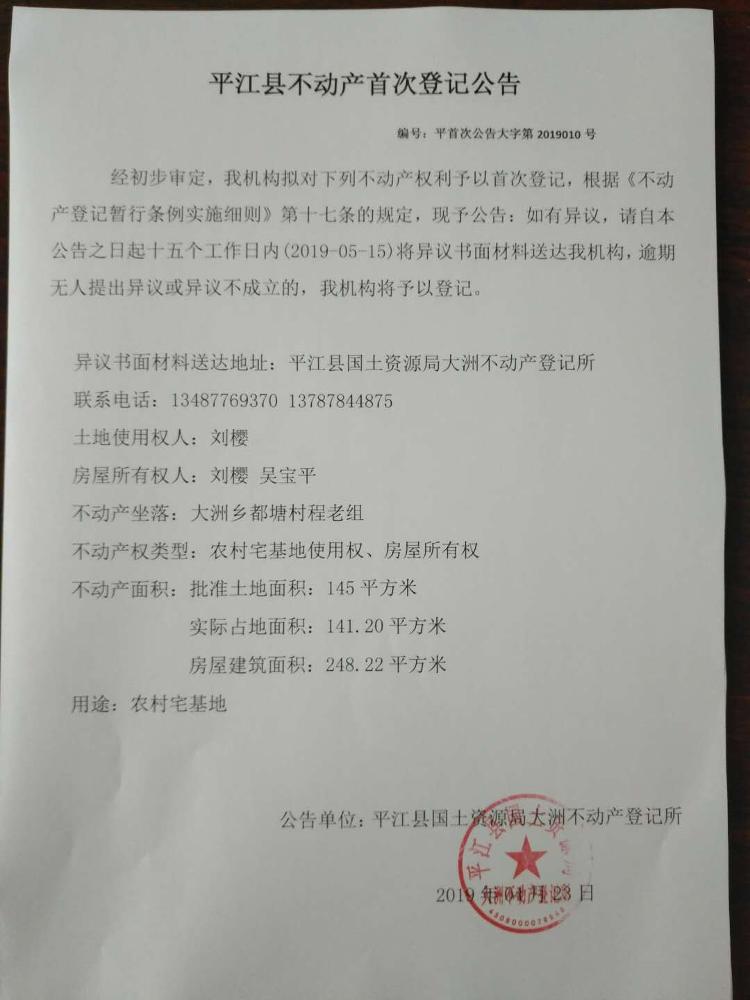 吴宝平、刘樱平江县不动产首次登记公告平首次公告大字第2019010号