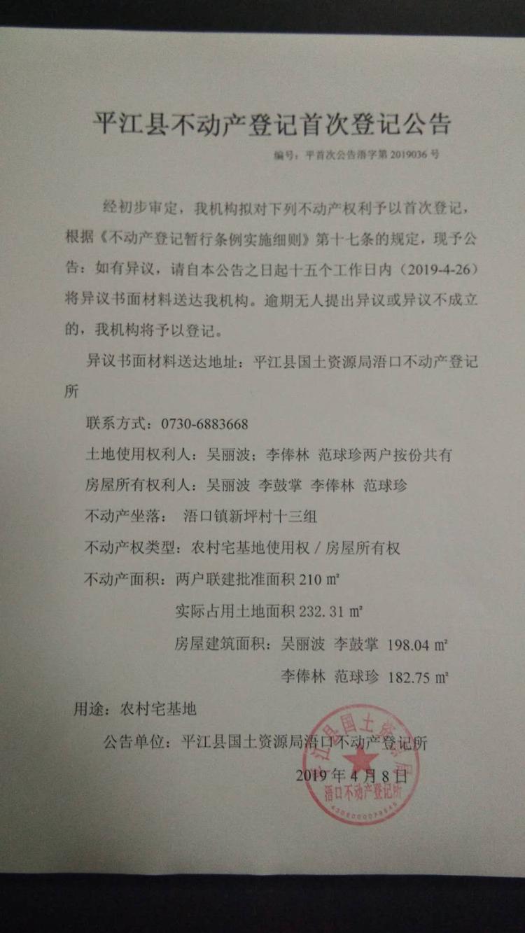 吴丽波、李鼓掌、李俸林、范球珍平江县不动产首次登记公告平首次公告浯字第2019036号