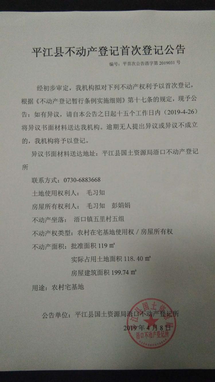毛习知、彭娟娟平江县不动产首次登记公告平首次公告浯字第2019031号