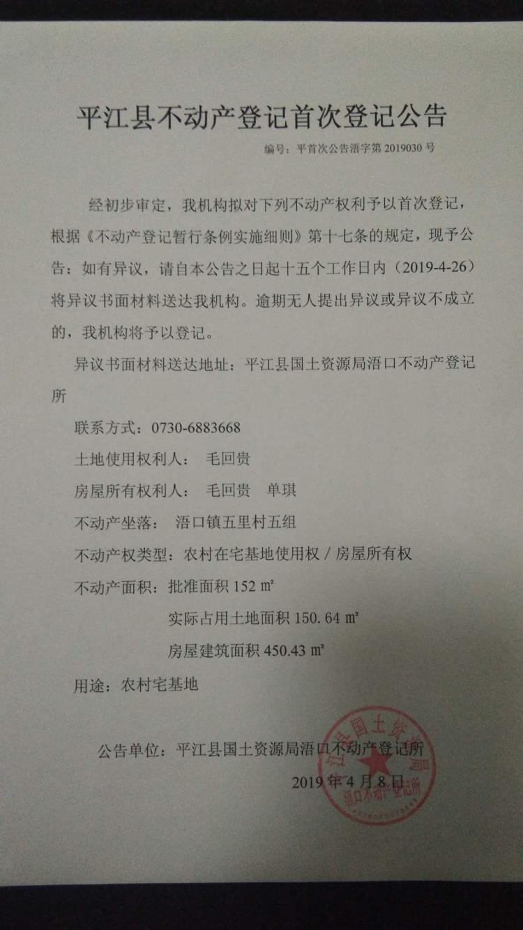 毛回贵、单琪平江县不动产首次登记公告平首次公告浯字第2019030号