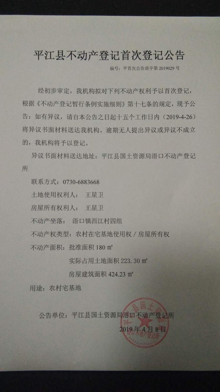 王星卫平江县不动产首次登记公告平首次公告浯字第2019029号