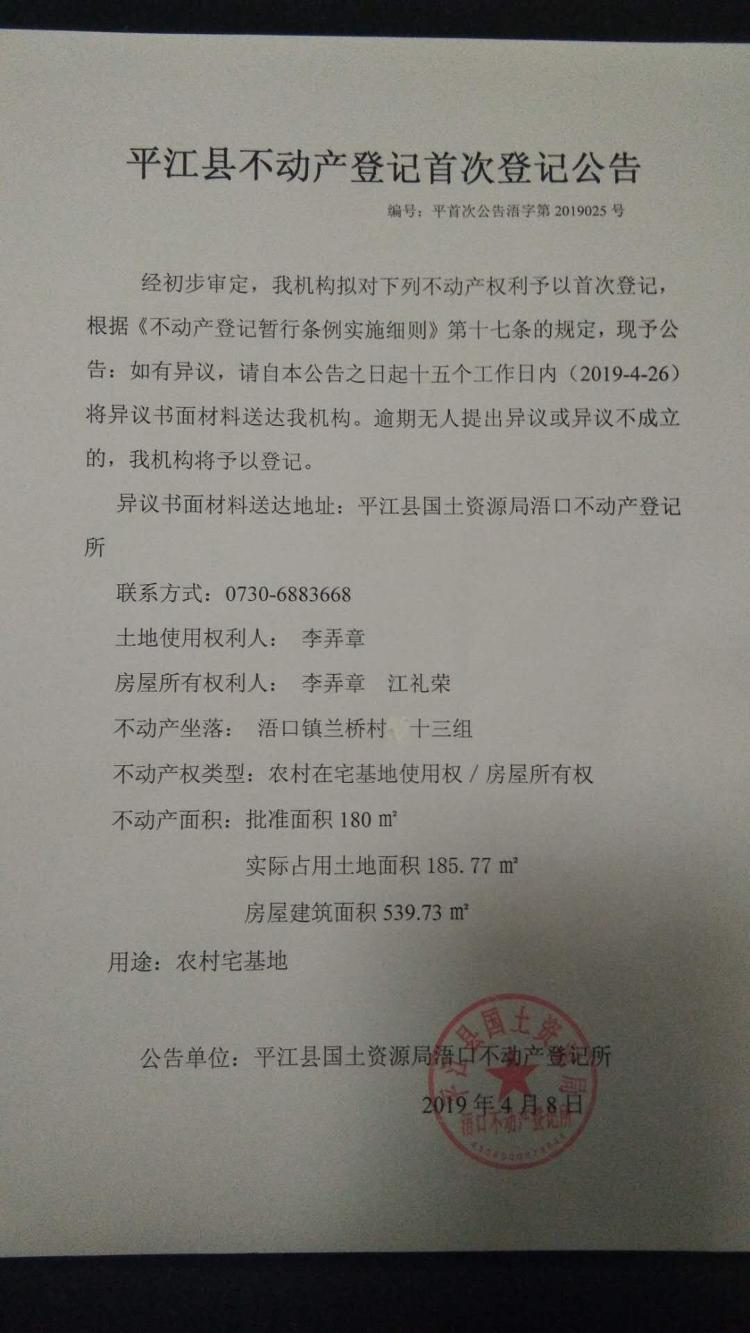 李弄章、江礼荣平江县不动产首次登记公告平首次公告浯字第2019025号