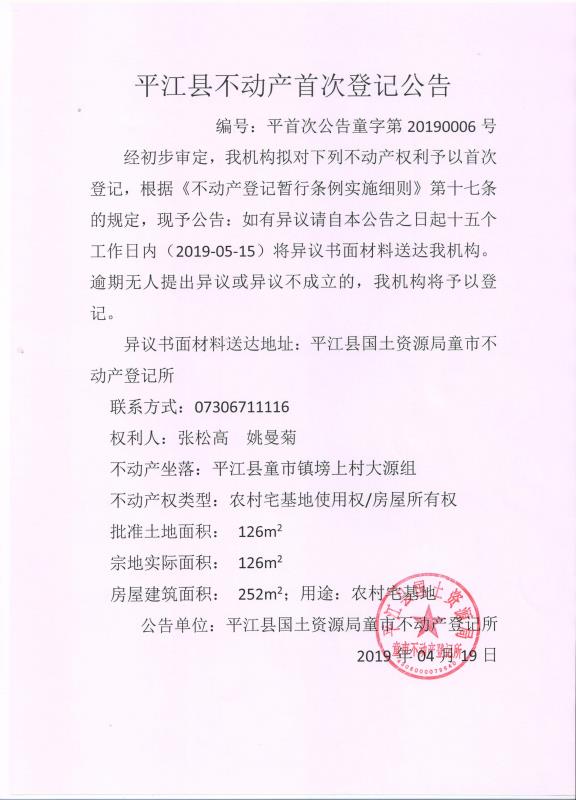 张松高、姚曼菊平江县不动产首次登记公告平首次公告童字第20190006号