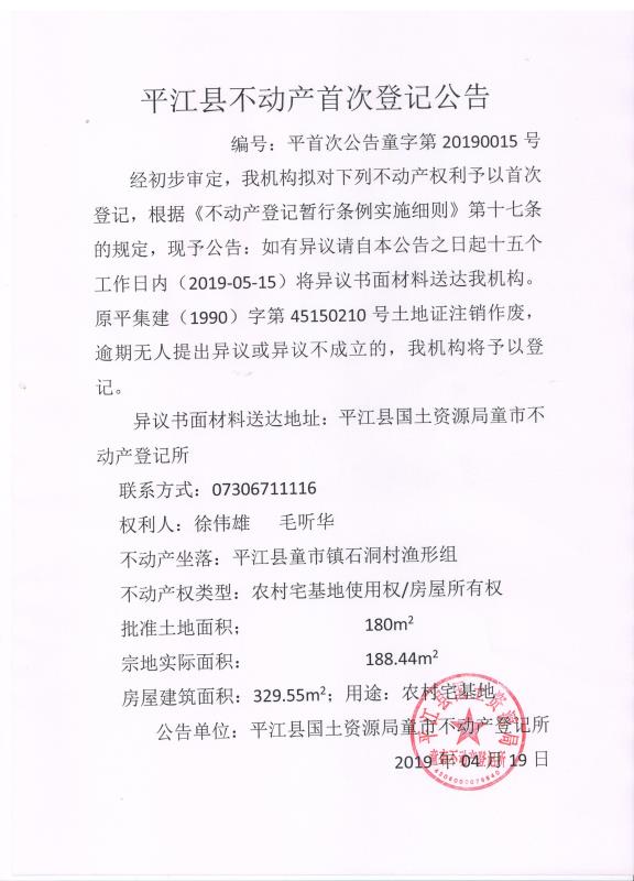 徐伟雄、毛听华平江县不动产首次登记公告平首次公告童字第20190015号