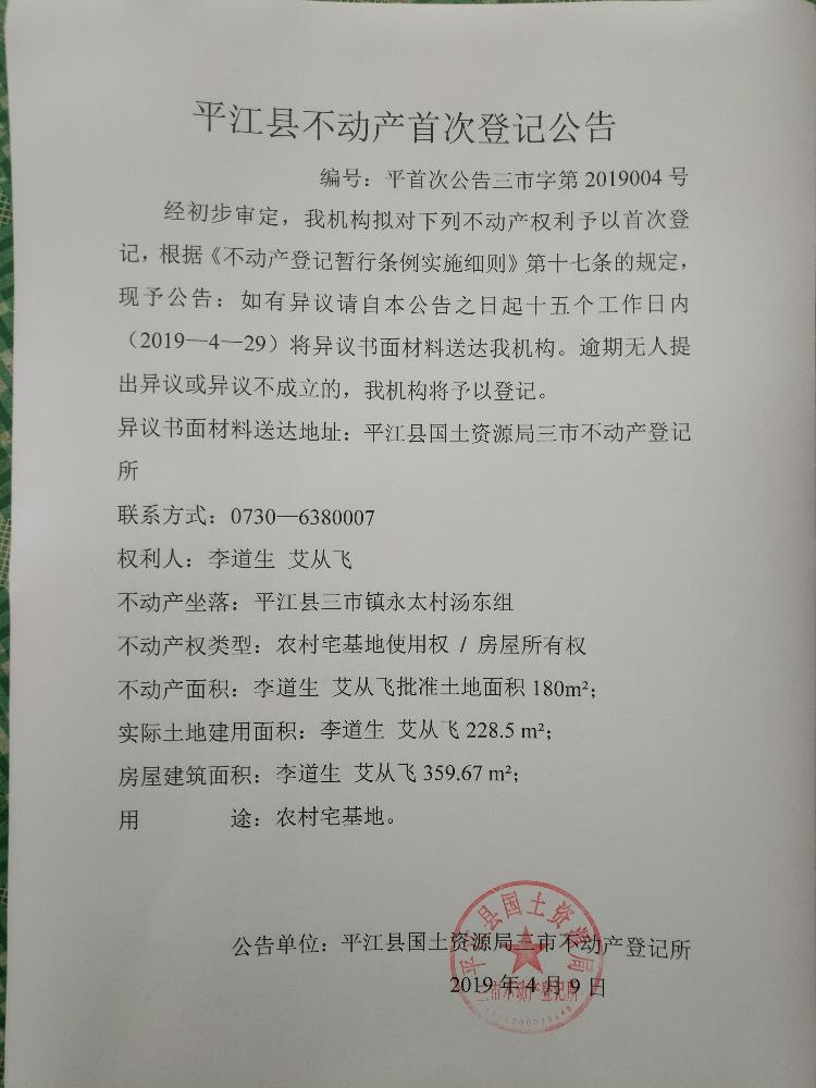 李道生、艾从飞平江县不动产首次登记公告平首次公告三市字第2019004号