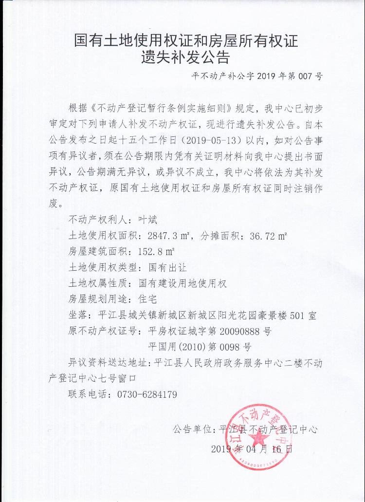 叶斌房屋所有权证和土地所有权证遗失补发公告平不动产补公字2019年第007号