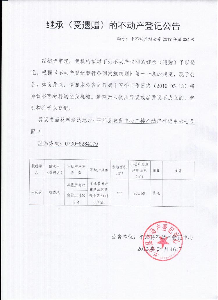 赖圆凤继承(受遗赠)的不动产登记公告平不动产继公字2019年第034号