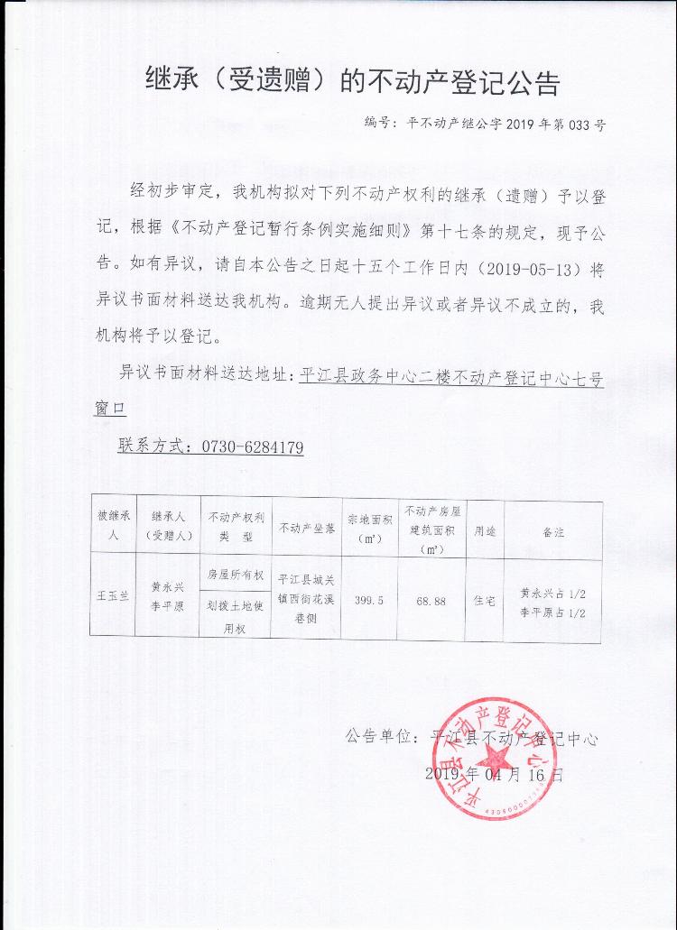 黄永兴、李平原继承(受遗赠)的不动产登记公告平不动产继公字2019年第033号