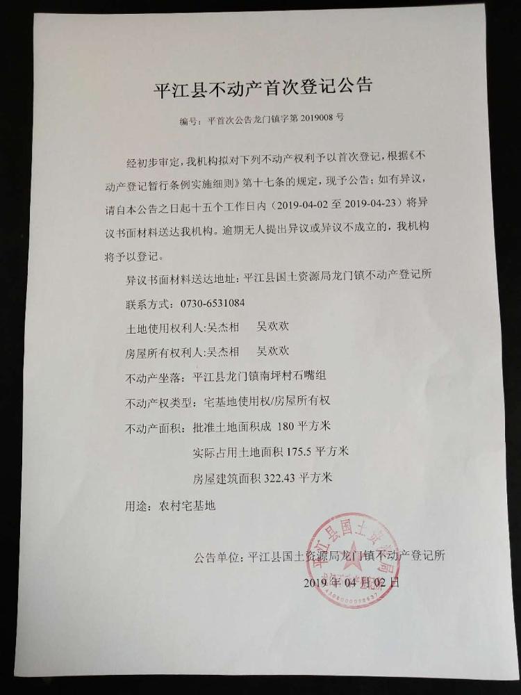 吴杰相、吴欢欢平江县不动产首次登记公告平首次公告龙门镇字第2019008号