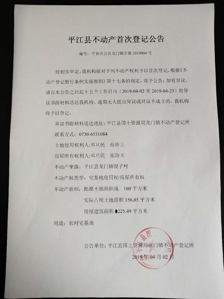 邓旦民、张珍玉平江县不动产首次登记公告平首次公告龙门镇字第2019004号