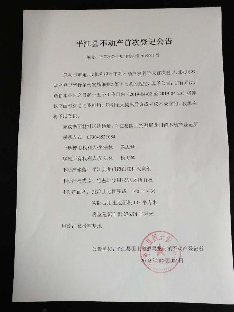 吴法林、杨志琴平江县不动产首次登记公告平首次公告龙门镇字第2019005号