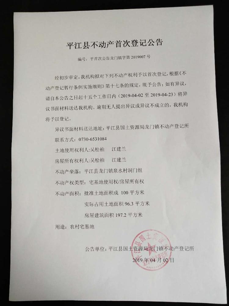 吴松柏、江建兰平江县不动产首次登记公告平首次公告龙门镇字第2019007号