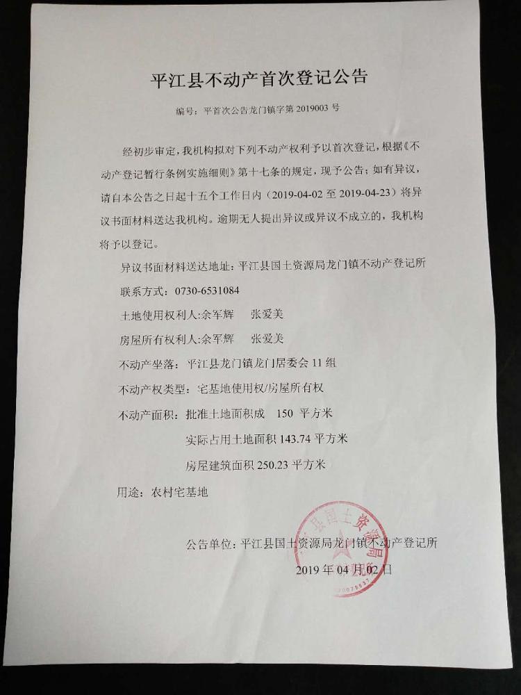 余军辉、张爱美平江县不动产首次登记公告平首次公告龙门镇字第2019003号